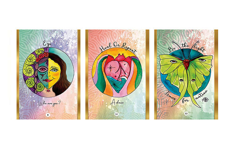 Michelle has created two oracle decks with me. This one a hand-drawn circular design. Project included 44 cards, box design, and booklet. Artwork was digitally refined and transformed into cards with custom-designed water colour backgrounds to complement her art.